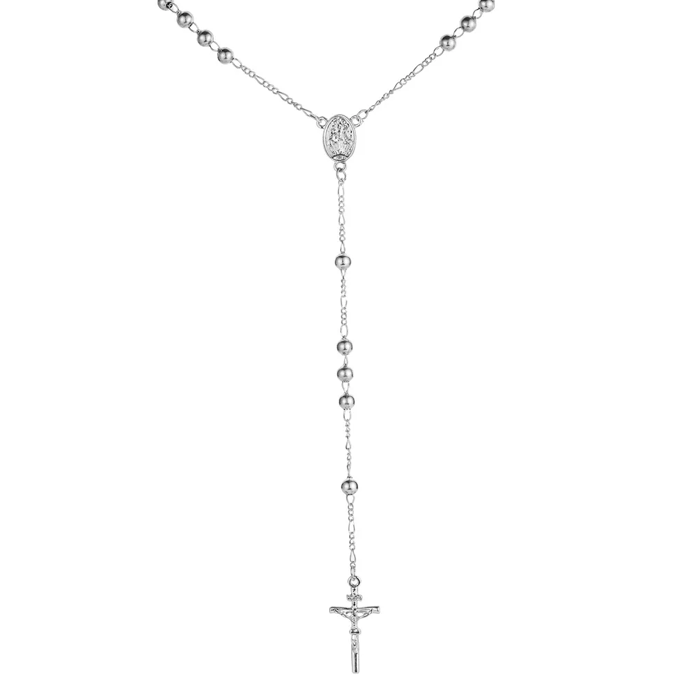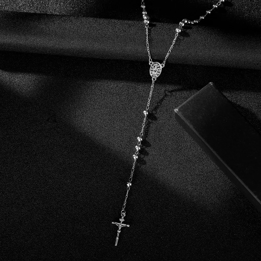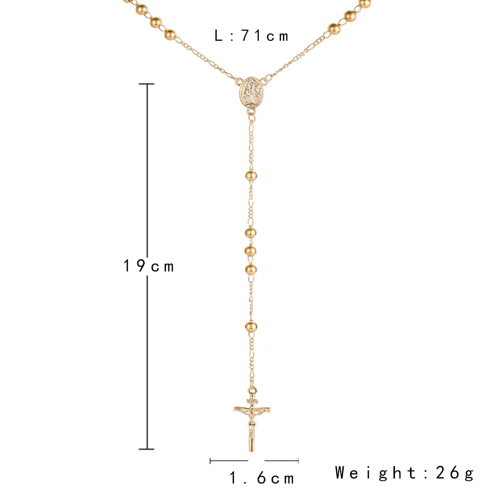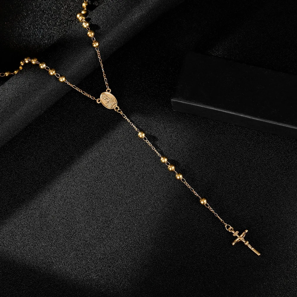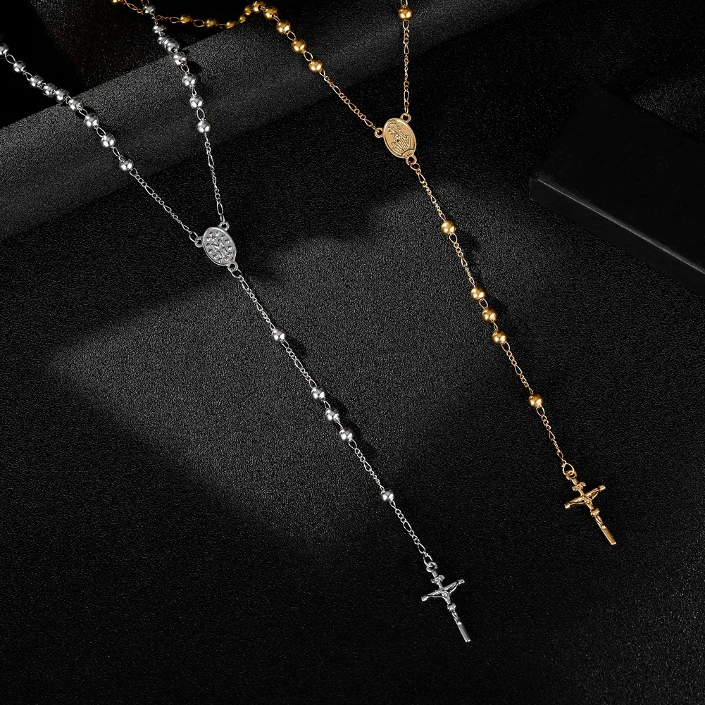 Personality Gold Plated Cross Rosary Pendant Necklace Jesus Beads Cross Hip Hop Necklace Long Chain for Men Women Jewelry Gifts