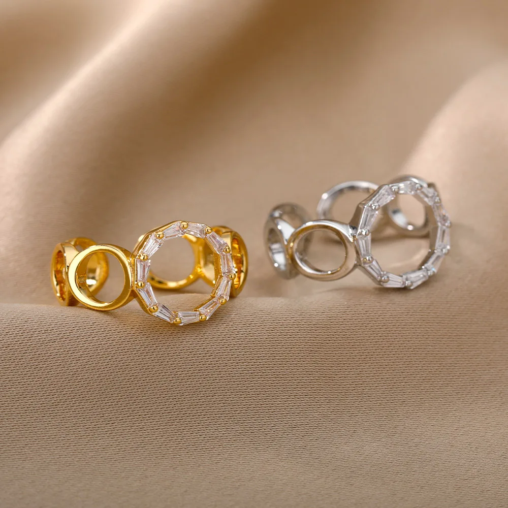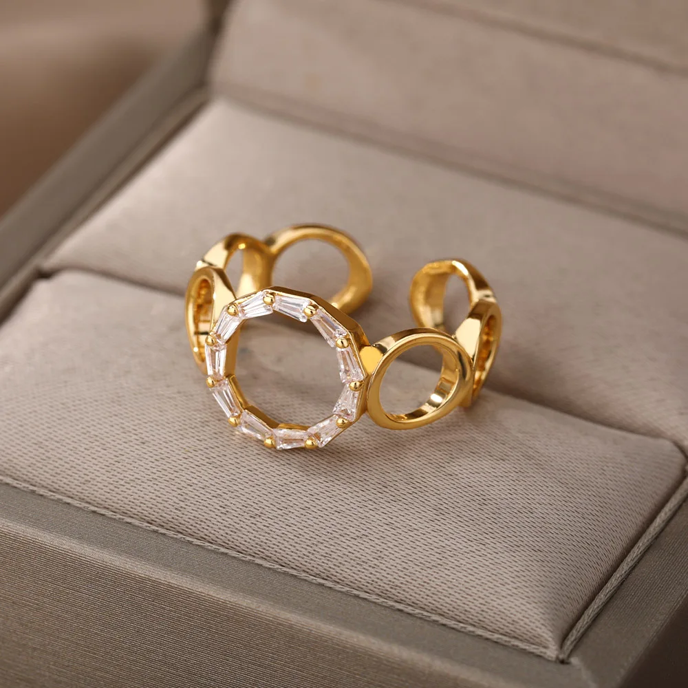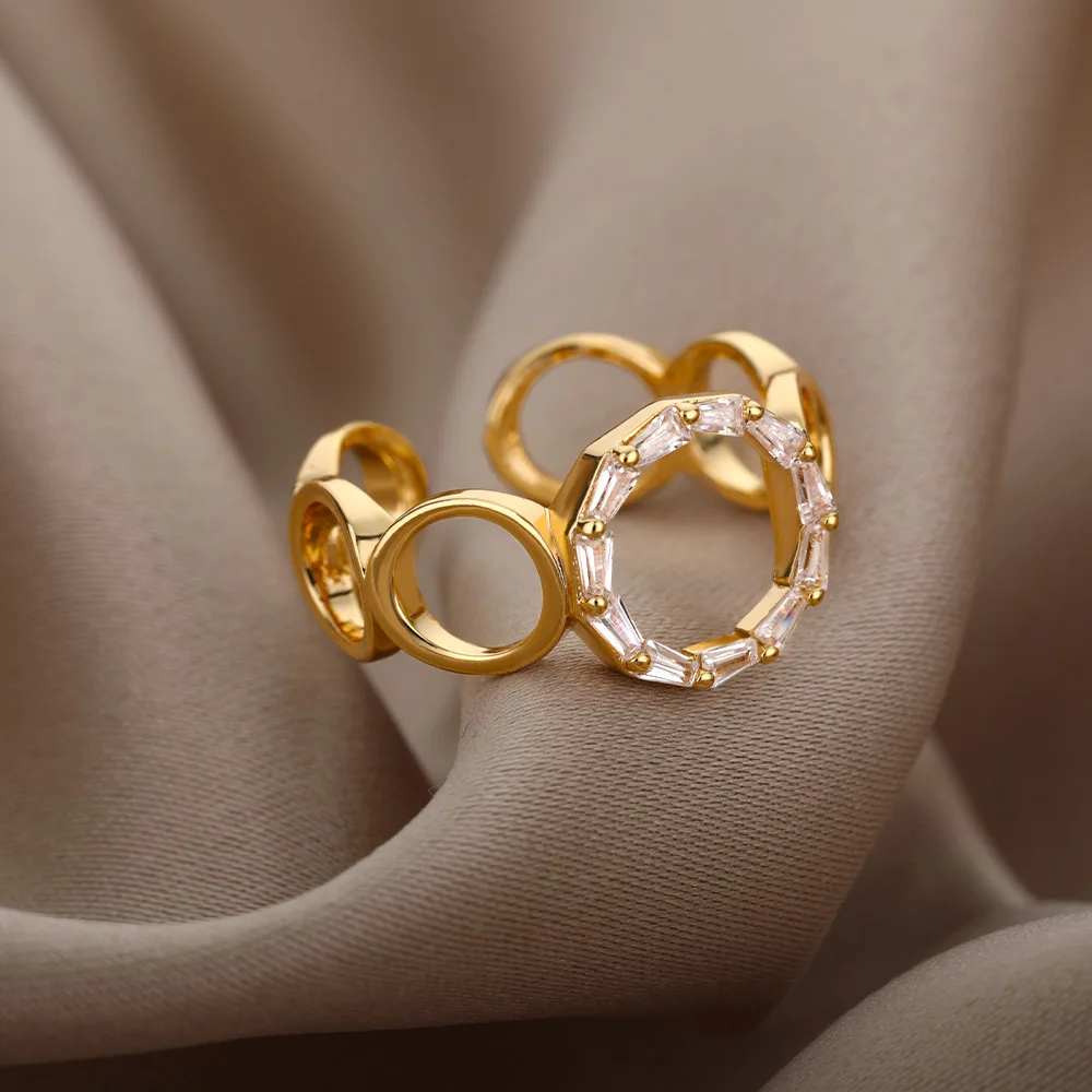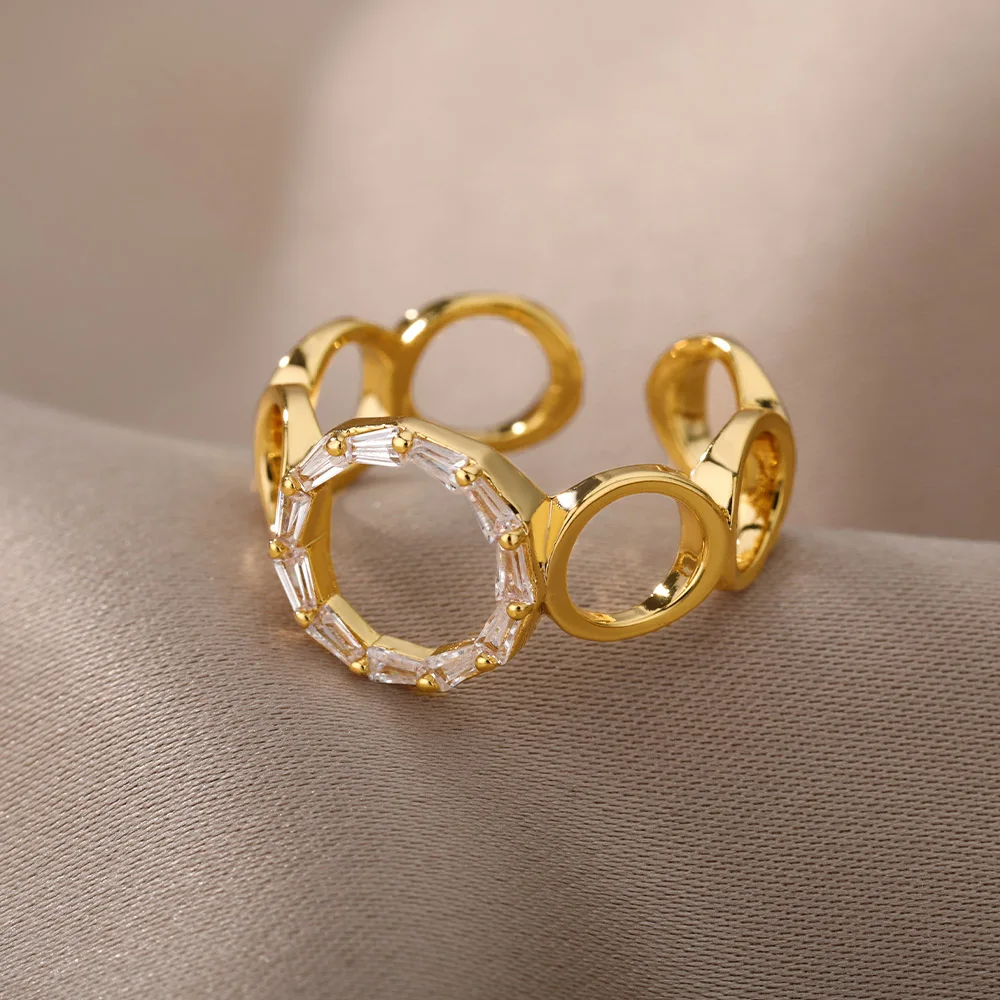 Zircon Hollow O-Shaped Open Rings For Women Stainless Steel Geometric Adjustable Crsytal Rings Charms Vintage Jewelry Gift
