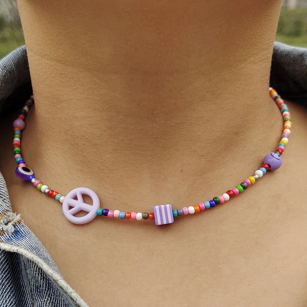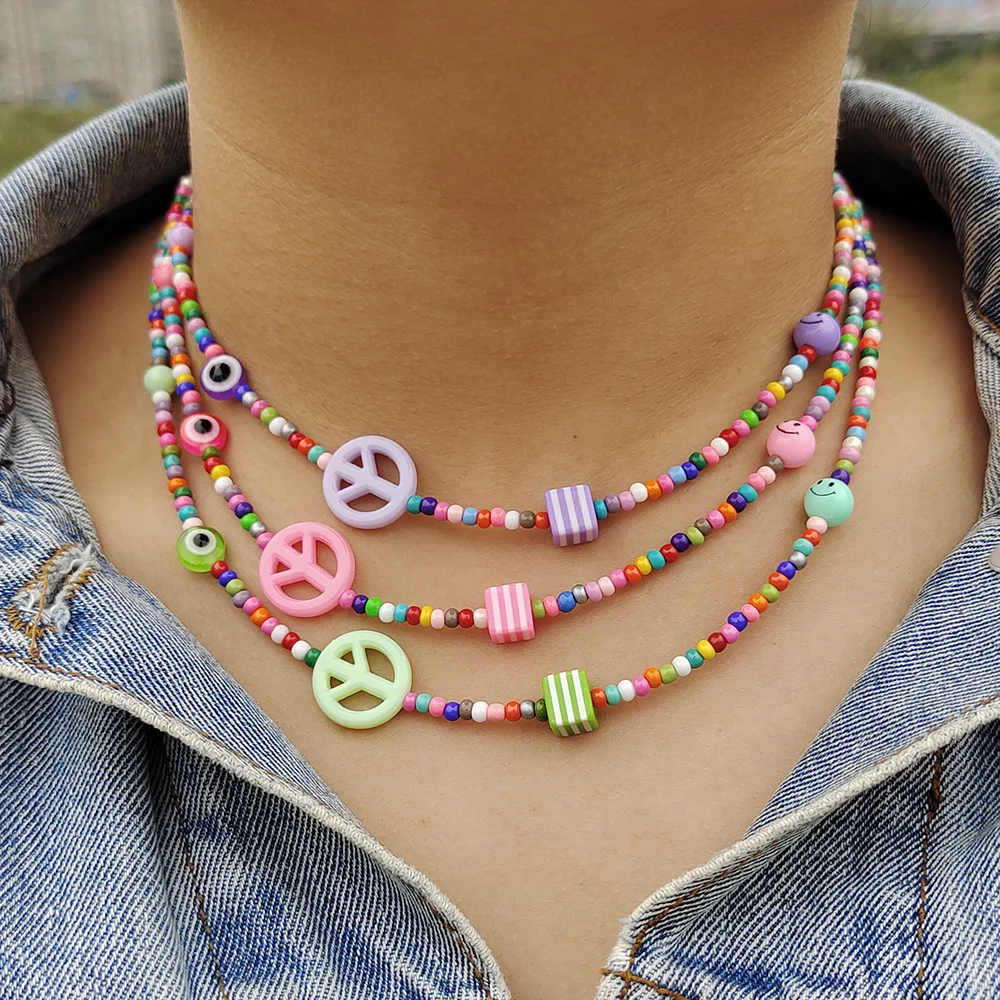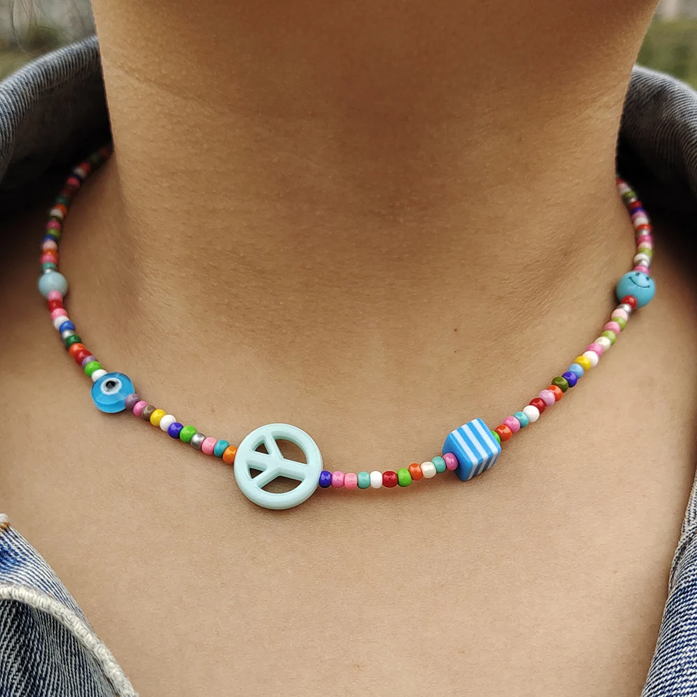 ZX Peace & Smiley Face & Eye Beaded Chain Necklace for Women Bohemian Handmade Girls Necklace Wholesale Party Accessories Gifts